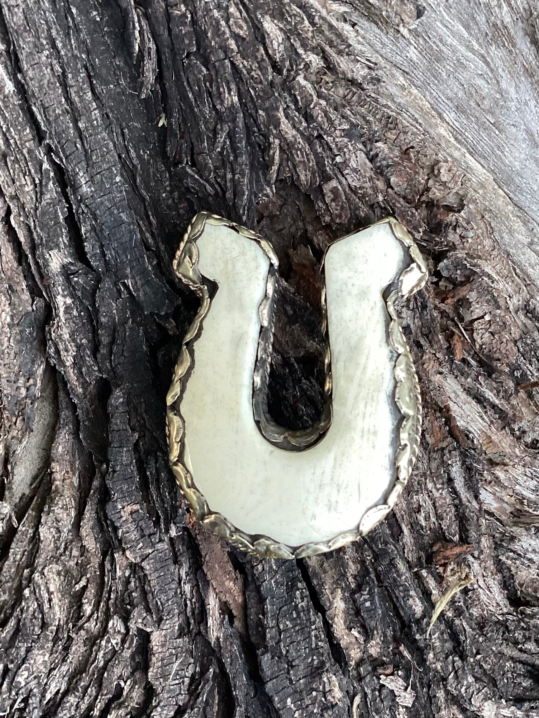 The carved bone horseshoe is sure to bring good luck this year. Set in Tibetan silver and trimmed in beautiful rope and scallop work.